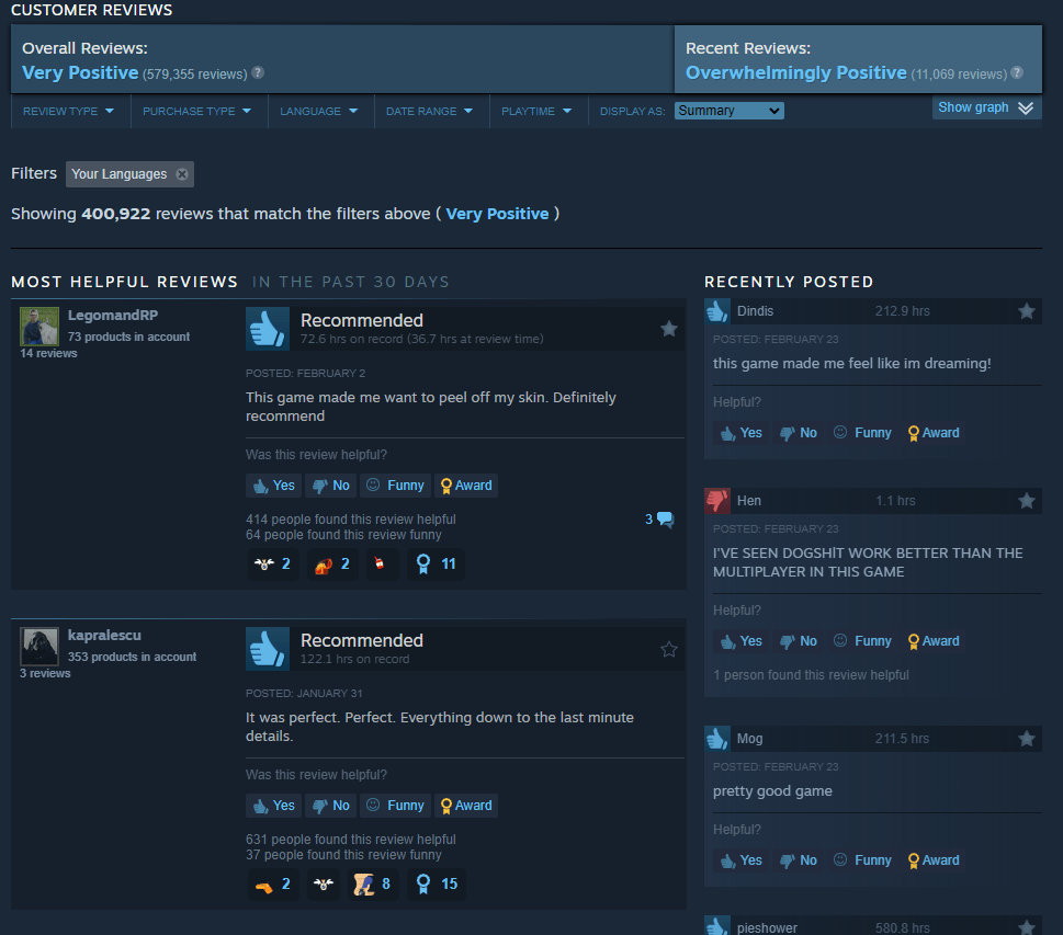 Finally, there’s the aggregate information at the top. It tells you very simply if the percentage of reviews are overwhelmingly negative, negative, mixed, positive, or overwhelmingly positive based on everyone who has reviewed the game. It also has a recent reviews section since video games tend to change over time as they receive updates. I appreciate the approach to this much more than I appreciate something similar like Rotten Tomatoes because it is consistent throughout. There’s nothing lost in translation from individual to aggregate like an arbitrary star system. Like I said, the straightforward nature of the system is where it shines the most. Honestly I wish this system were more universal. I’m tired of trying to figure out what a bunch of stars or X/10 means.