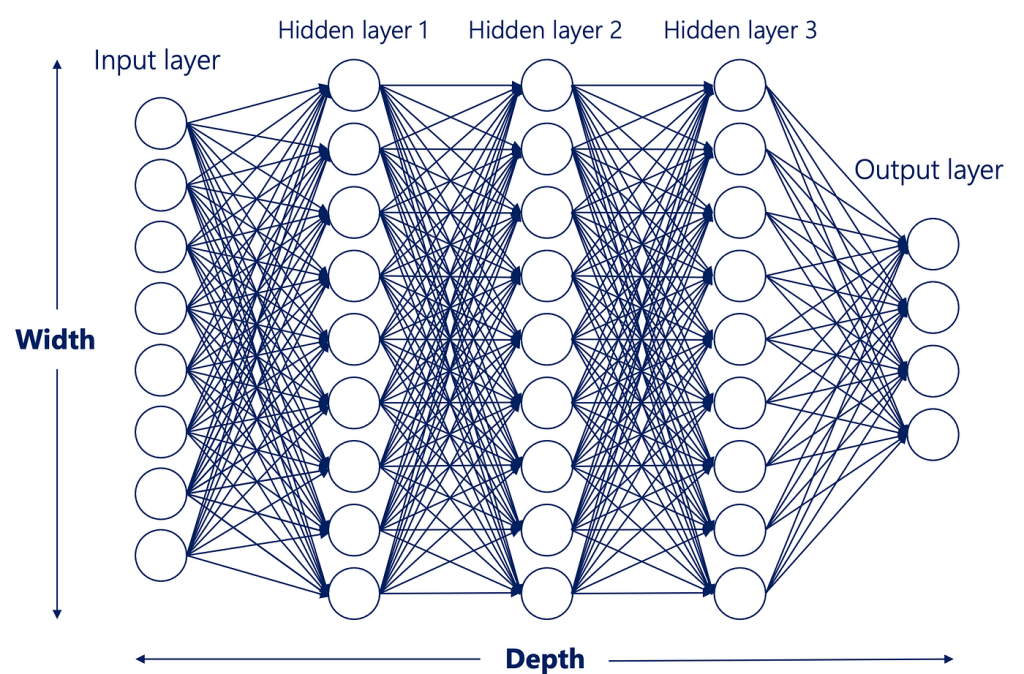 This layer has five neurons. Each neuron takes four inputs and has one weight associated with each input. It multiplies each input by each weight, then adds them all together, and adds the neuron’s bias on top of that. 20 multiplications, and then it sums them up. A larger network might look like this.