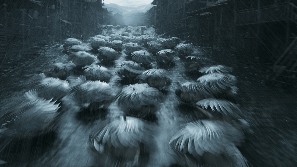 The acting and the insane action and crazy twists do get a little ridiculous at times, but they never over stay their welcome so much that it’s not still cool. Like here, the secret army that the Commader builds up uses a bunch of umbrellas stacked atop one another to slide down the main street of Jingzhou firing wrist-mounted crossbows to take out all the town guards.