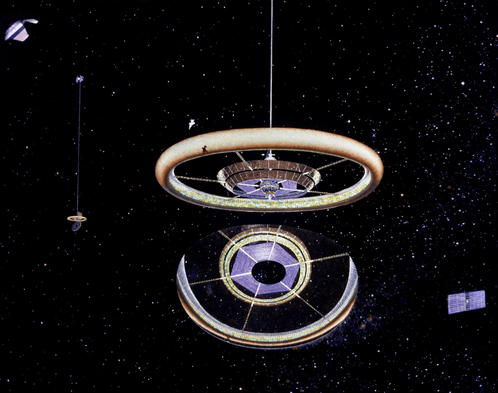 The Stanford Torus. Note the giant mirror that reflects sunlight onto the solar panels.