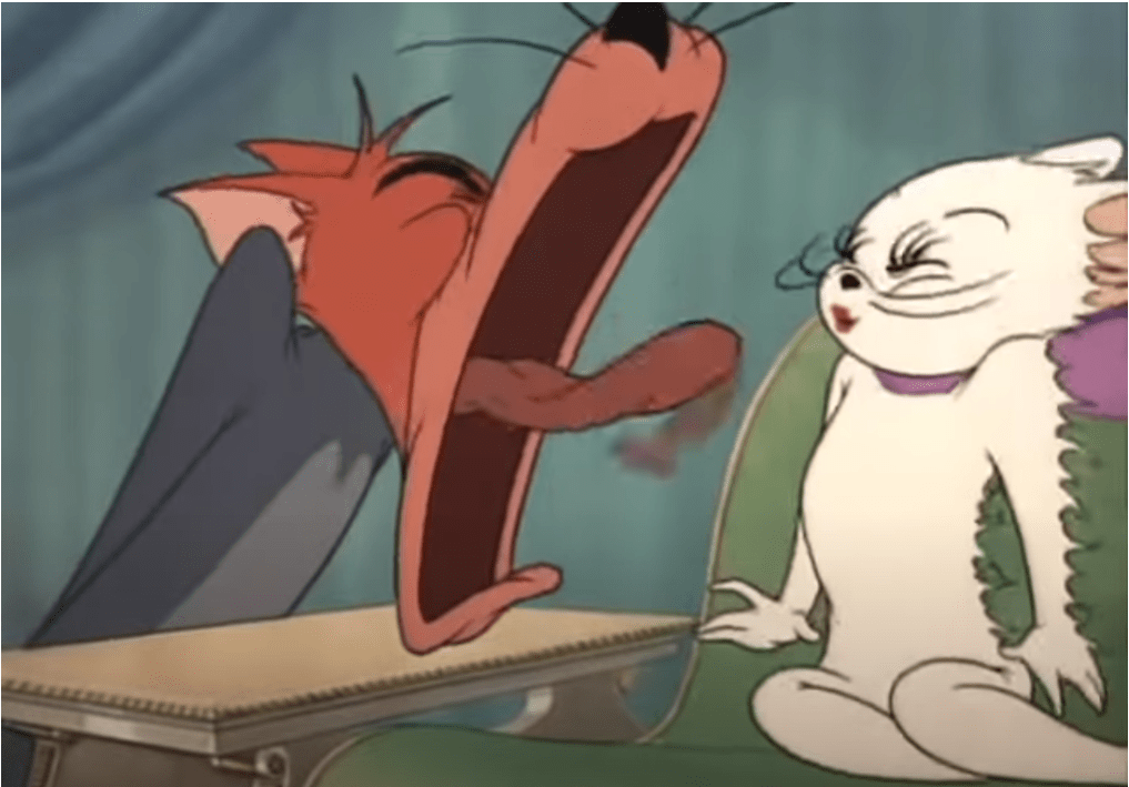 Just as funny to look at, but it’s a little less straightforward. Here, Tom is trying to impress the lady cat (who’s name is Toodles Galore by the way), adding a social layer to the joke. When Jerry crushes Tom’s tail off screen, he makes this face and embarrasses himself. Of course it’s still obvious even to a child why being embarrassed in front of your girlfriend to this extent is hilarious, so I’d still put this firmly into the straightforward category, but if you squint your brain maybe you could see this being written down somehow. What I’m trying to say is that beyond the visual there is a conceptual aspect to the joke that doesn’t need any visual support. It’s the most basic form of the ‘clever’ side of jokes that I mentioned I love to see. It wouldn’t be as funny without Toodles there for Tom to get embarrassed over. I think this hints at a deeper level of humor that is much easier to bring out through words than a purely visual gag.