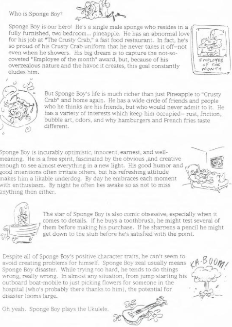 Another cartoon from my childhood that still gets me laughing every time I see a still frame is Spongebob Squarepants. This is the kind of children’s show that tries to appeal to adults as much as it can because the writers know who really changes the channel. It results in a lot of funny jokes that a kid just won’t get, probably because they’re just too clever. I could give you a thousand, maybe ten thousand funny stills from Spongebob to talk about, but honestly I think all of them pale in comparison to the raw humor present in the concept of Spongebob Squarepants. Here is how Stephen Hillenburg originally pitched Spongebob from the 1997 Spongebob pitch bible. He was known as Sponge Boy back then.